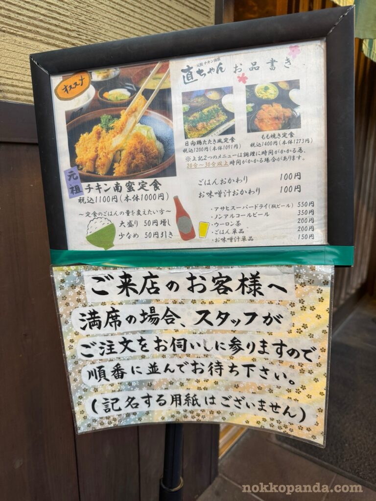 メニューはシンプルで、チキン南蛮定食かもも焼き定食、たたき定食のいずれかと飲み物しかありません。
