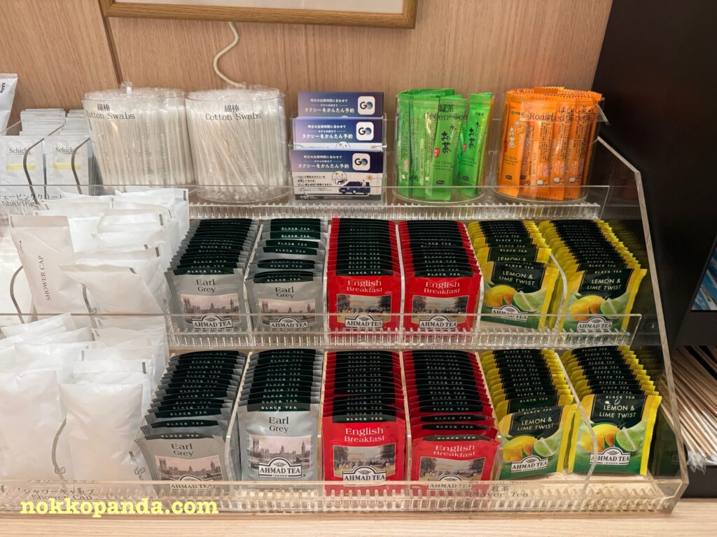 天空橋駅から徒歩5分ぐらいと電車でのアクセスもよく、アメニティのお茶の種類が豊富なのが嬉しいポイントです。紅茶系は私が愛飲するAHMADが数種類、それにほうじ茶がある♪