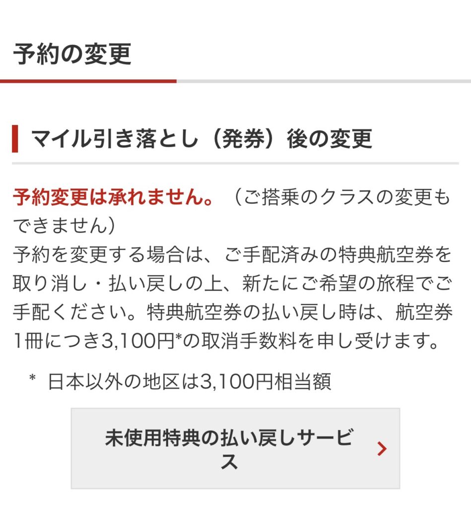 ↓特典航空券の変更について(JALのHP)