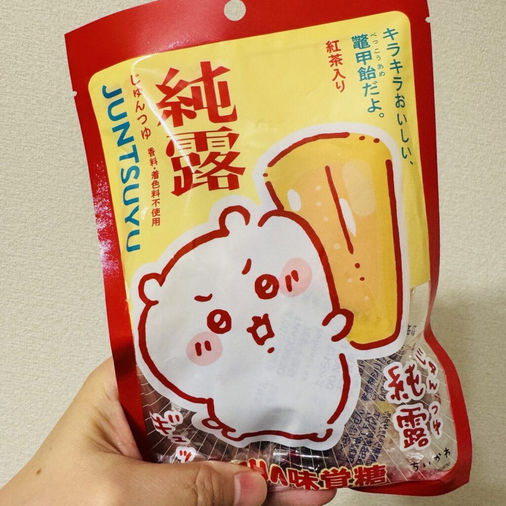 これは最近見つけた紅茶味の懐かしい飴「純露」のちいかわパッケージ。うさぎやハチワレのもあったよ。