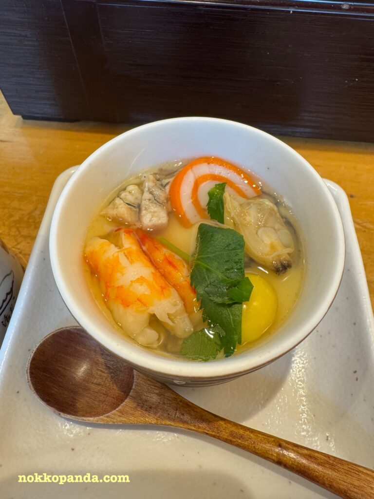 そしてここでのヒットがこの具沢山の茶碗蒸し。エビやかまぼこの彩りが嬉しい。この赤巻かまぼこが郷土の味ですわ。