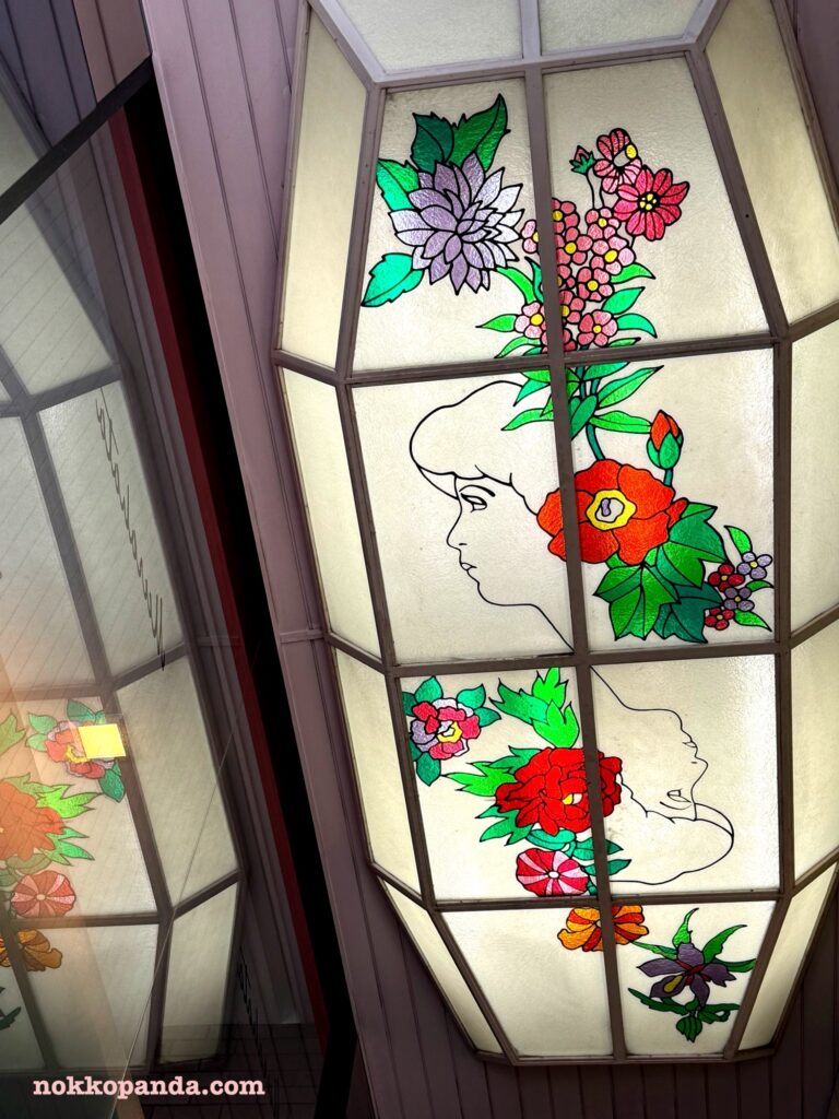 天井のステンドグラス風デザインがエモい。