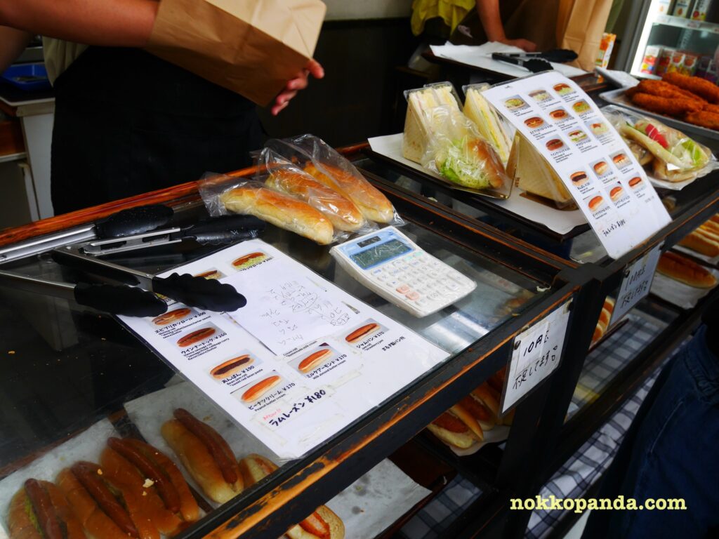 コロッケパン、ホットドッグ、甘いのも気になる。三角サンドイッチも美味しそう。
