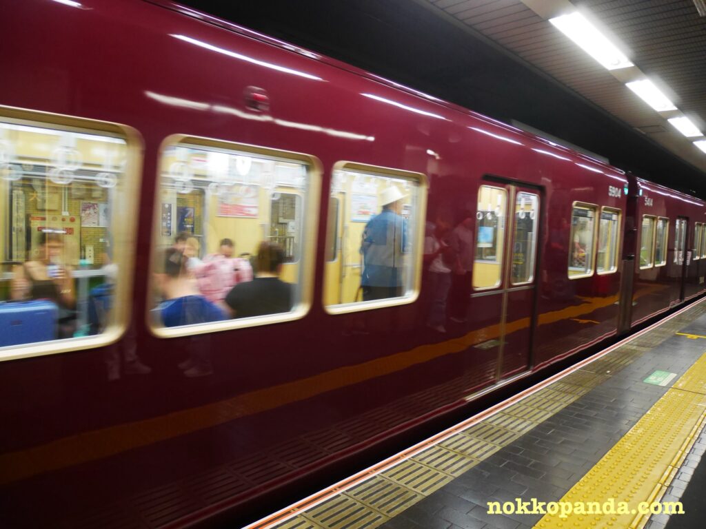 高級感あるボルドーカラーの車体の阪急線に乗って移動しました。