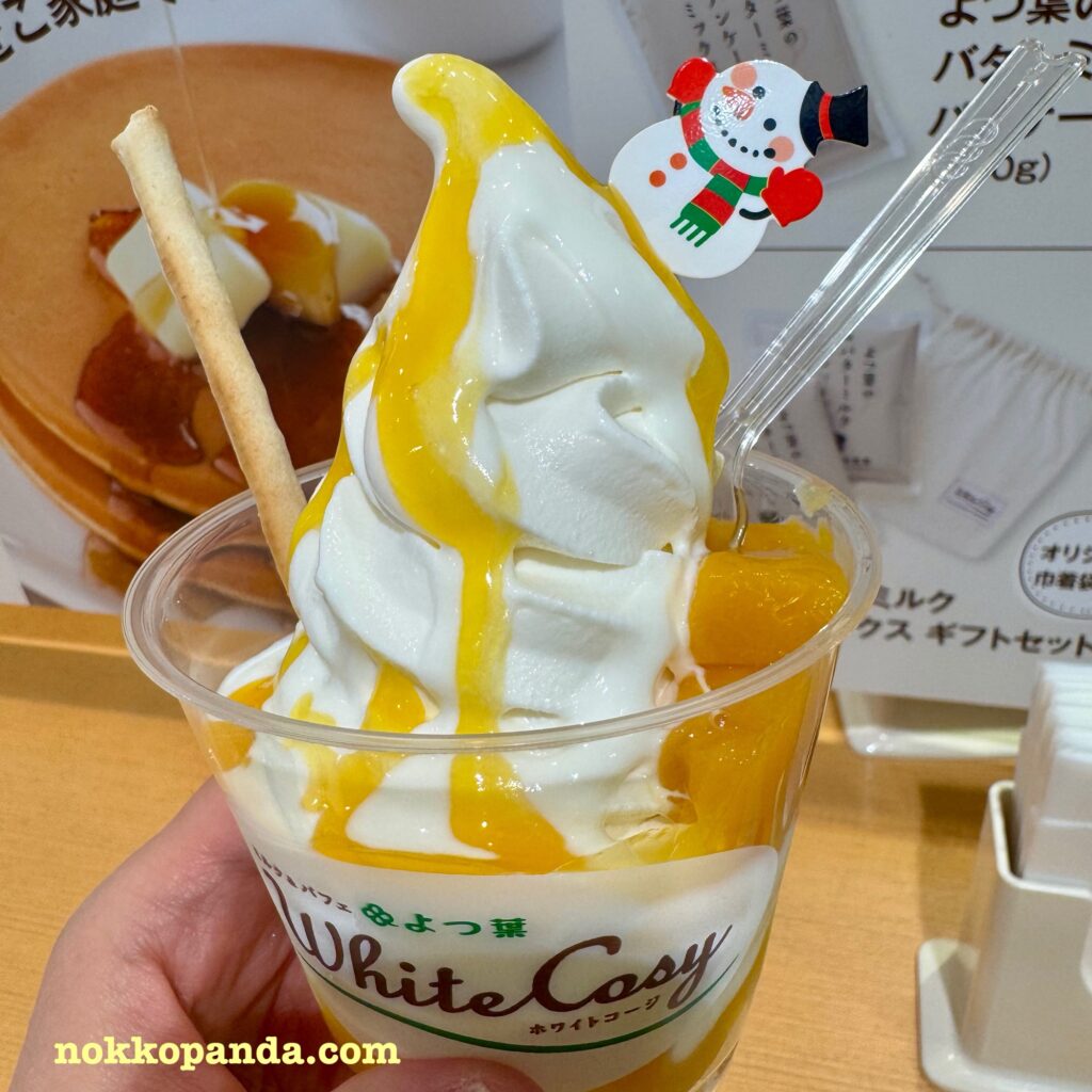 よつ葉の美味しいソフトクリームにマンゴーソースがかけられて、ヨーグルト味も楽しめちゃう。