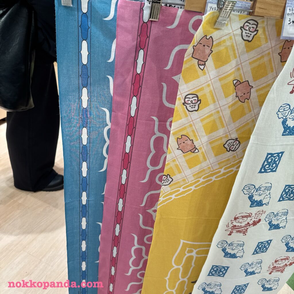 水色とブルーの、アイヌ系の図柄の手拭いがかわいい。